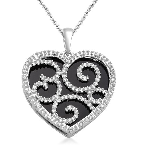 Sterling silver onyx with genuine white diamonds heart pendant (0.10 cttw, i-j color, i2-i3 clarity), 18".